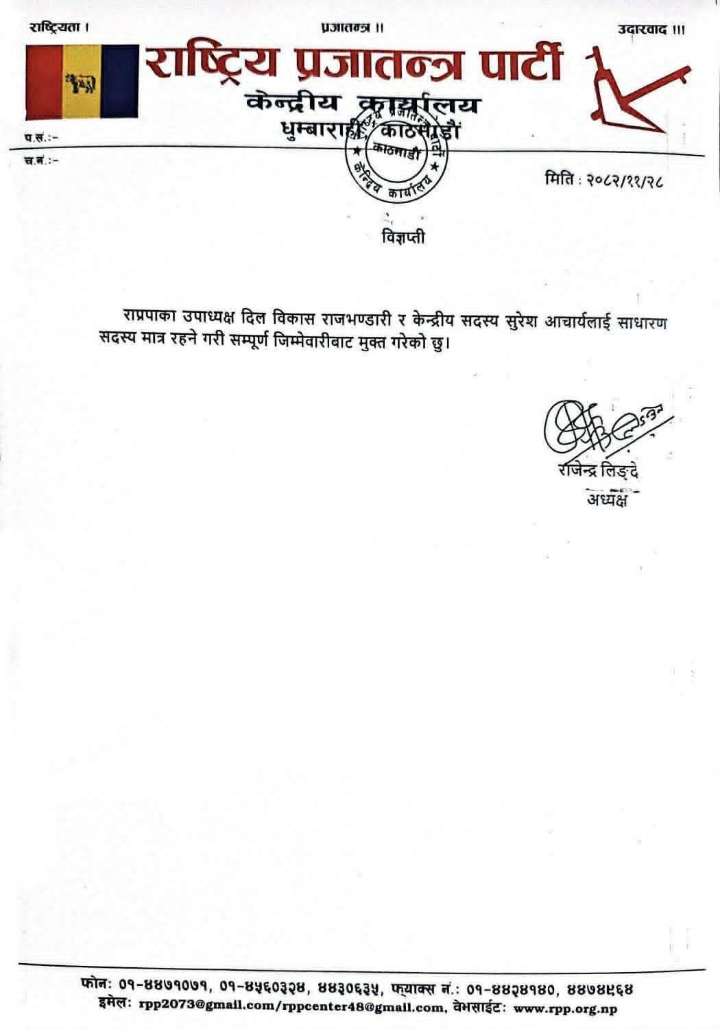 राष्ट्रिय प्रजातन्त्र पार्टीका अध्यक्ष राजेन्द्र लिङ्देनले दुई जना नेताहरूलाई जिम्मेवारीबाट हटाएका छन्।
