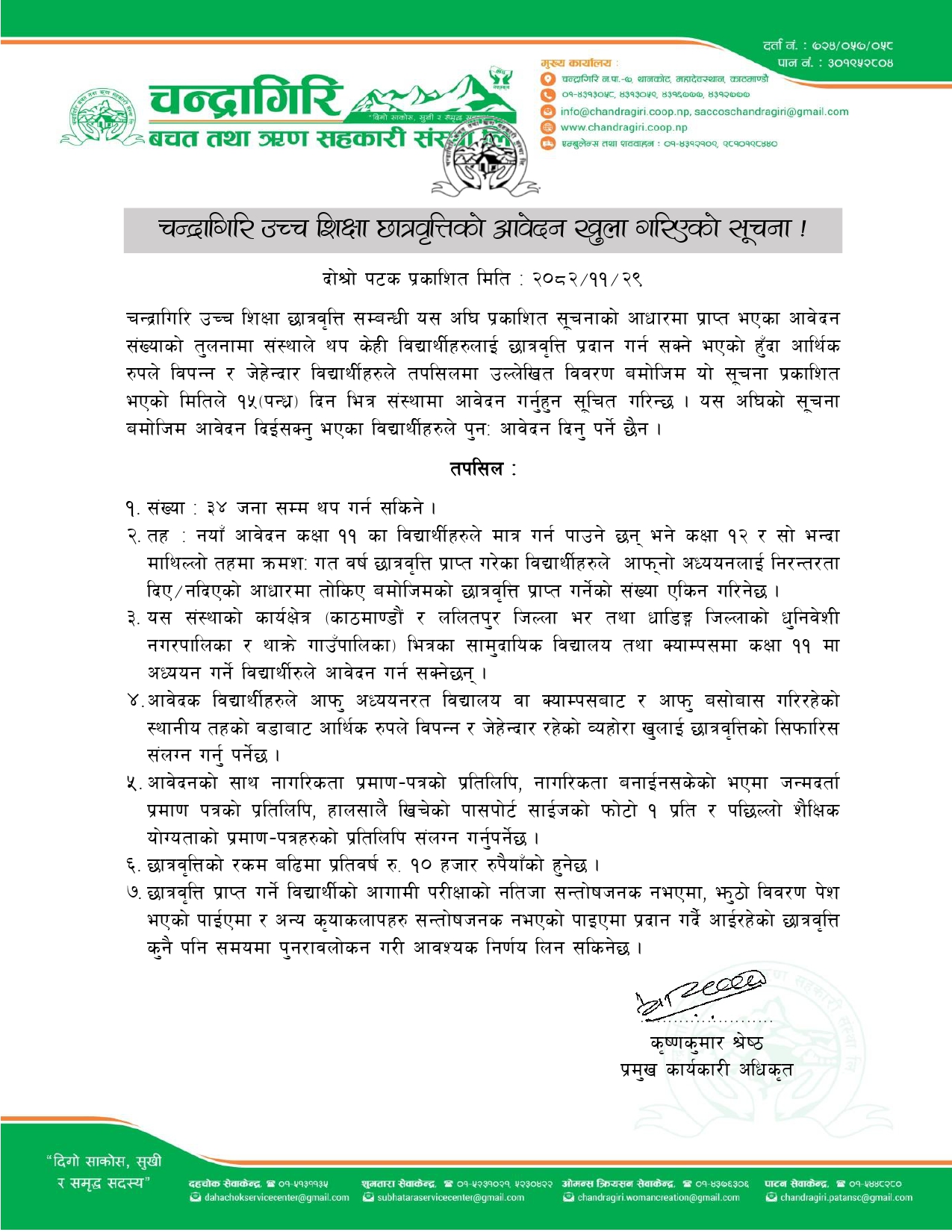 उच्च शिक्षा अध्ययन गर्न चाहने विद्यार्थीहरूका लागि छात्रवृत्ति उपलब्ध गराउँदै आएको चन्द्रागिरि बचत तथा ऋण सहकारी संस्थाले थप ३४ जनाका लागि छात्रवृत्ति उपलब्ध गराउन सकिने जनाउँदै दोश्रो पटक सूचना जारी गरेको छ ।