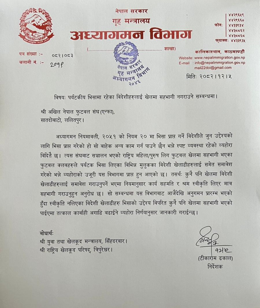 कुनै पनि खेलमा विदेशी खेलाडीहरूलाई समावेश गराउनुपर्ने भएमा नियमानुसार कार्य सहमति र श्रम स्वीकृति लिएर मात्र सहभागी गराउन एन्फालाई अनुरोध गरेको छ ।