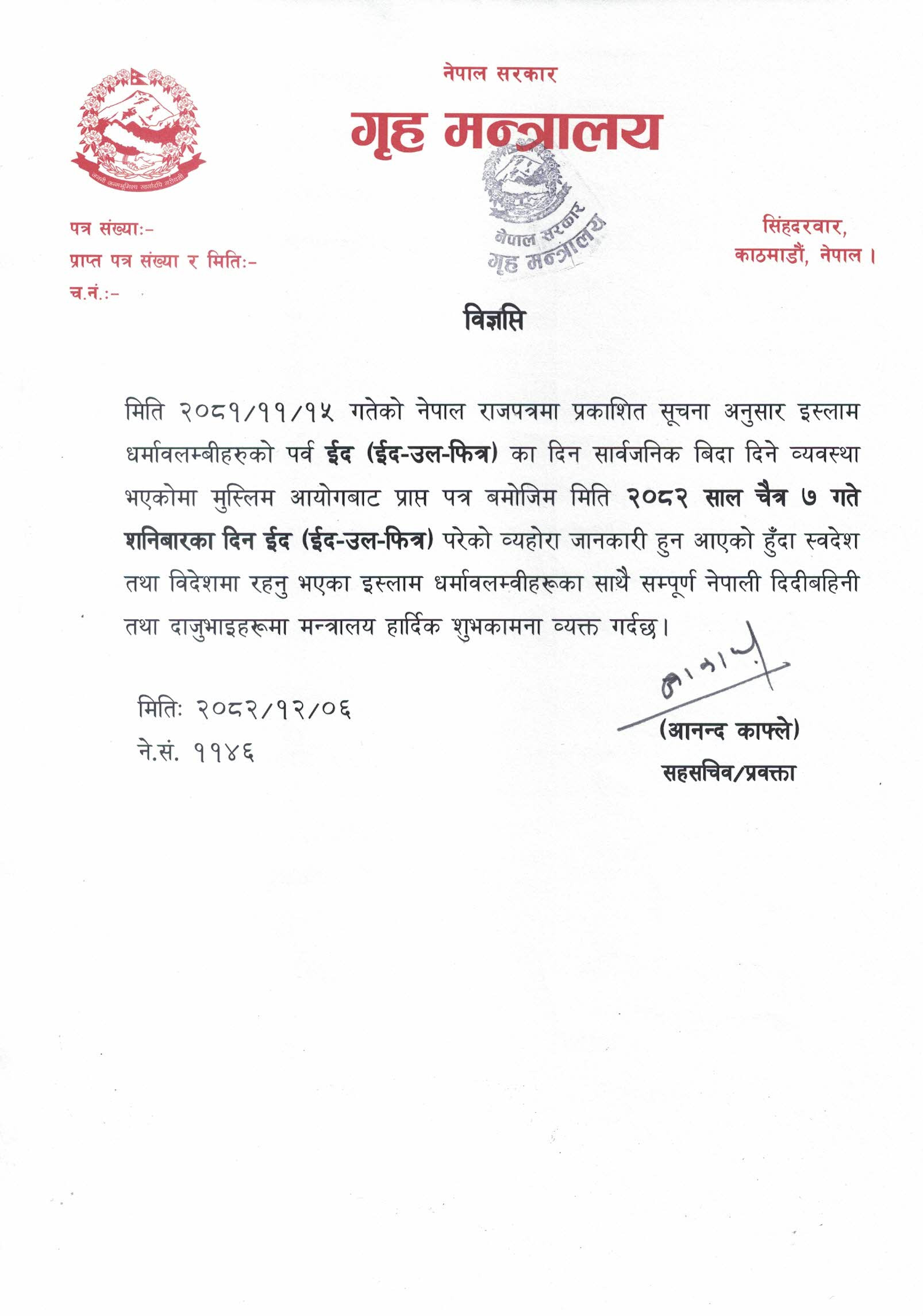 मन्त्रालयले नेपाल राजपत्रमा ईदको बिदा दिने प्रबन्ध गरिएको र मुस्लिम आयोगबाट प्राप्त जानकारीबमोजिम यही चैत ७ गते शनिबार उक्त पर्व पर्ने भएकाले स्वदेश तथा विदेशमा रहेका इस्लाम धर्मावलम्बी एवं नेपालीहरूमा शुभकामना दिएको छ ।
