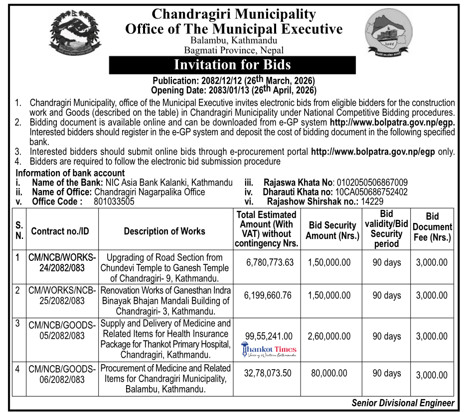 चन्द्रागिरि नगरपालिकाद्वारा करोडाैंको बोलपत्र आह्वान भएको छ ।
