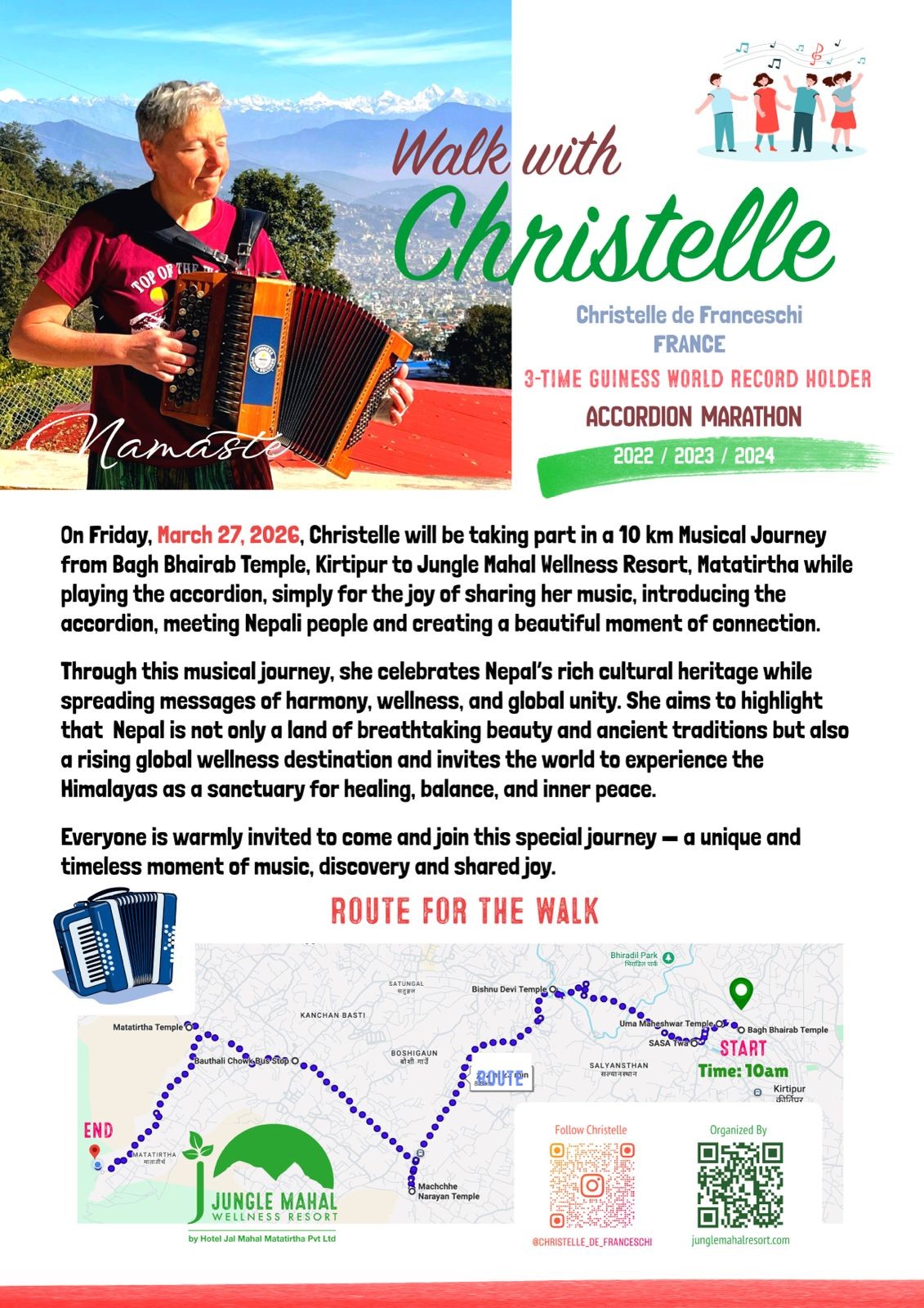 ३ पटक गिनिज बुकमा रेकर्ड राख्न सफल फ्रेन्च एकर्डियन वाद्यवादक क्रिस्टेल डे फ्रान्सेचीले कीर्तिपुरस्थित बाघभैरव मन्दिरदेखि चन्द्रागिरि नगरपालिका-०८ मातातिर्थस्थित जंगल महल वेलनेस रिसोर्टसम्म १० किलोमिटर लामो पैदल सांगितिक यात्रा गर्ने भएकी हुन् ।