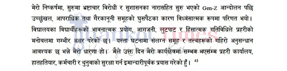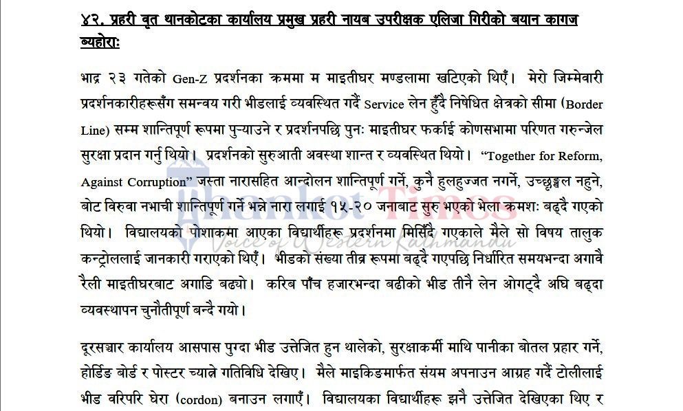 ९०७ पृष्ठको सो प्रतिवेदनमा जेन-जी आन्दोलनका सन्दर्भमा विभिन्न व्यक्तिहरूसँग बयान लिइएको विषय समेत समावेश भएको छ । जसअनुसार प्रहरी वृत्त थानकोट प्रमुख डीएसपी एलिजा गिरीको बयान समेत सामेल छ । यस्तै, प्रहरी प्रभाग बलम्बु प्रमुख प्रहरी निरीक्षक लक्ष्मी खड्कासँग पनि आयोगले बयान लिएको छ ।