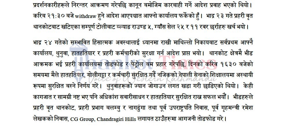 गत भदाै २४ भएको प्रदर्शनका क्रममा प्रहरी वृत्त थानकोट, प्रहरी प्रभाग बलम्बु, प्रहरी प्रभाग नागढुङ्गामा समेत व्यापक क्षति पुगेको थियो ।