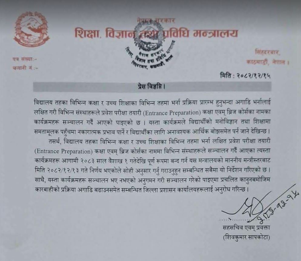 ”२०८३ साल वैशाख १ गतेदेखि पूर्ण रूपमा बन्द गर्न यस मन्त्रालयको माननीय मन्त्रीस्तरबाट निर्देशन गरिएको छ,” शिक्षा विज्ञान तथा प्रविधि मन्त्रालयको विज्ञप्तिमा भनिएको छ । सरकारको निर्देशन अवज्ञा गर्दै कक्षा सञ्चालन भएमा कानुन अनुसार कारबाही गर्ने बताइएको छ ।