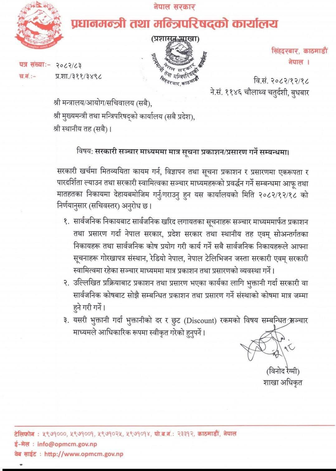 सूचनाअनुसार सरकारी खर्चमा मितव्ययिता कायम गर्न, विज्ञापन तथा सूचना प्रकाशन तथा प्रसारणमा एकरूपता र पारदर्शिता ल्याउन तथा सरकारी स्वामित्वका सञ्चार माध्यमहरूको प्रवर्द्धन गर्ने उद्देश्यले यस्तो निर्णय गरिएको जनाइएको छ।