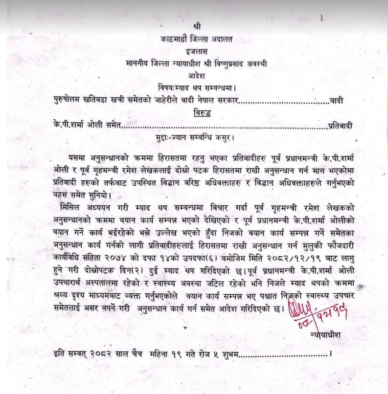 काठमाडौं जिल्ला अदालतका न्यायाधीश विष्णुप्रसाद अवस्थीको इजलासले ओलीमाथि अनुसन्धान गर्न थप दुई दिनको समय थप गरिदिएको हो ।