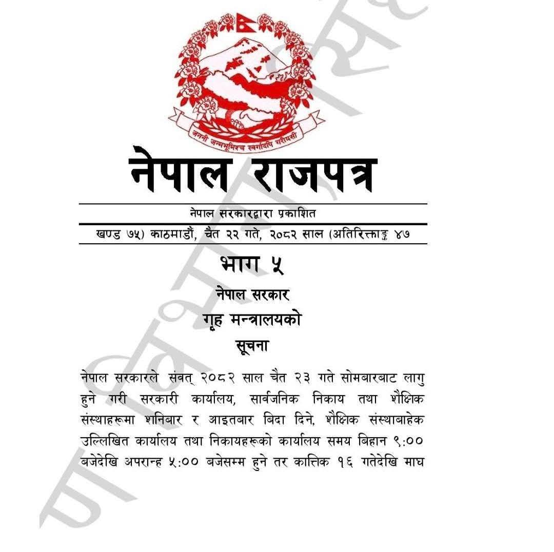 मन्त्रिपरिषदको निर्णय गृह मन्त्रालयले हिजो नै राजपत्रमा प्रकाशन गरेर सरकारी कार्यालय, सार्वजनिक निकाय तथा शैक्षिक संस्थाहरूमा शनिबार र आइतबार बिदा दिने, शैक्षिक संस्थाबाहेक कार्यालय तथा निकायहरू सञ्चालनको समय आजदेखि बिहान ९ बजेदेखि बेलुकी ५ बजेसम्म कायम हुने जनाएको हो ।