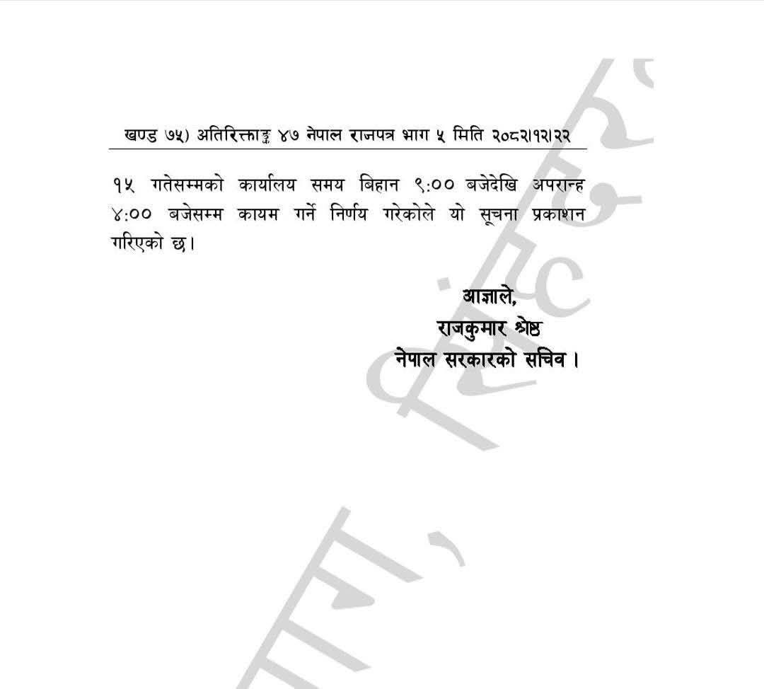 कात्तिक १६ गतेदेखि माघ १५ गतेसम्म भने कार्यालय समय बिहान ९ बजेदेखि दिउँसो बजेसम्म कायम गर्ने राजपत्रमा उल्लेख छ ।