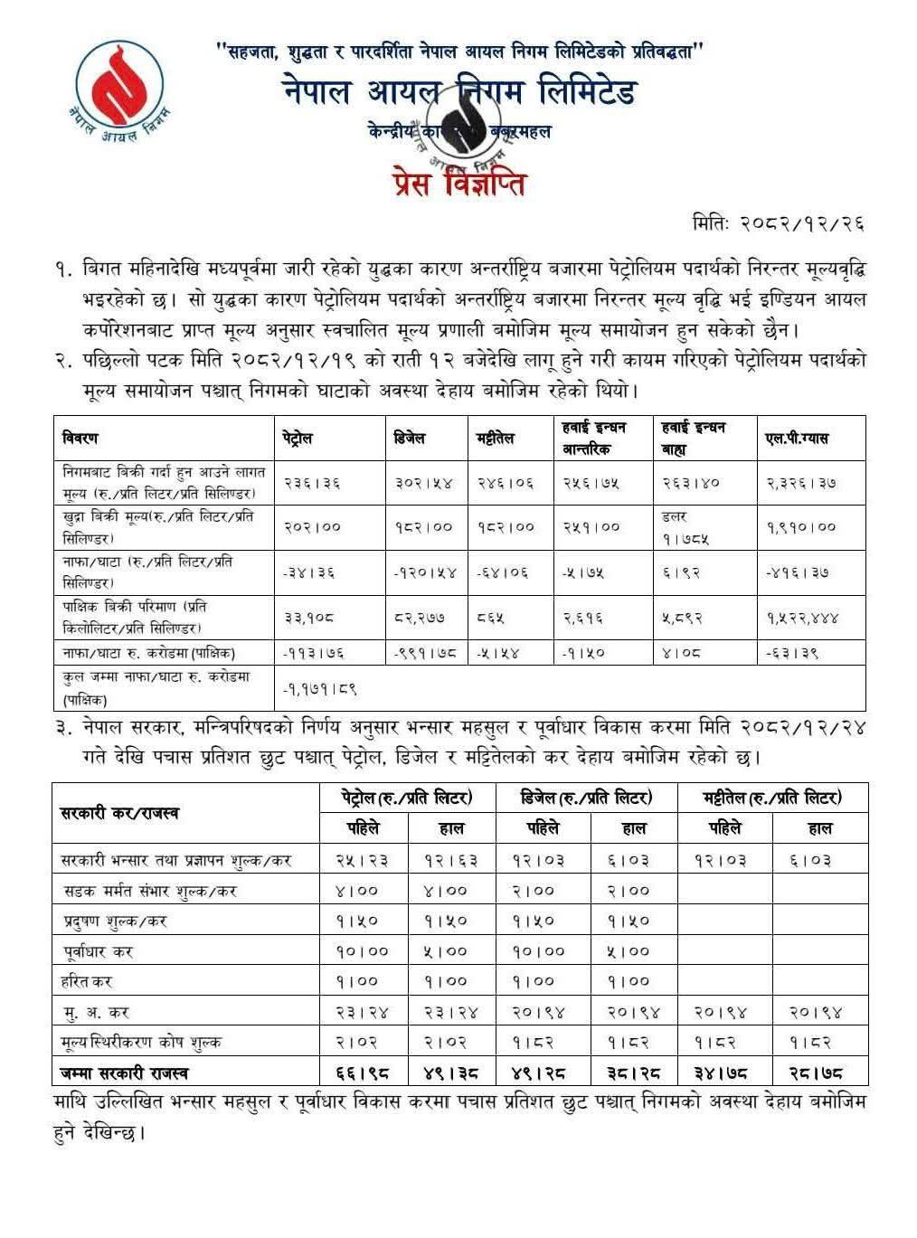 निगमले बिहीबार पेट्रोलमा प्रतिलिटर १७ रुपैयाँ, डिजेल/मट्टीतेलमा प्रतिलिटर २५ रुपैयाँ र खाना पकाउने एलपी ग्यासमा प्रतिसिलिन्डर १०० रुपैयाँले मूल्य बढाएको हो ।
