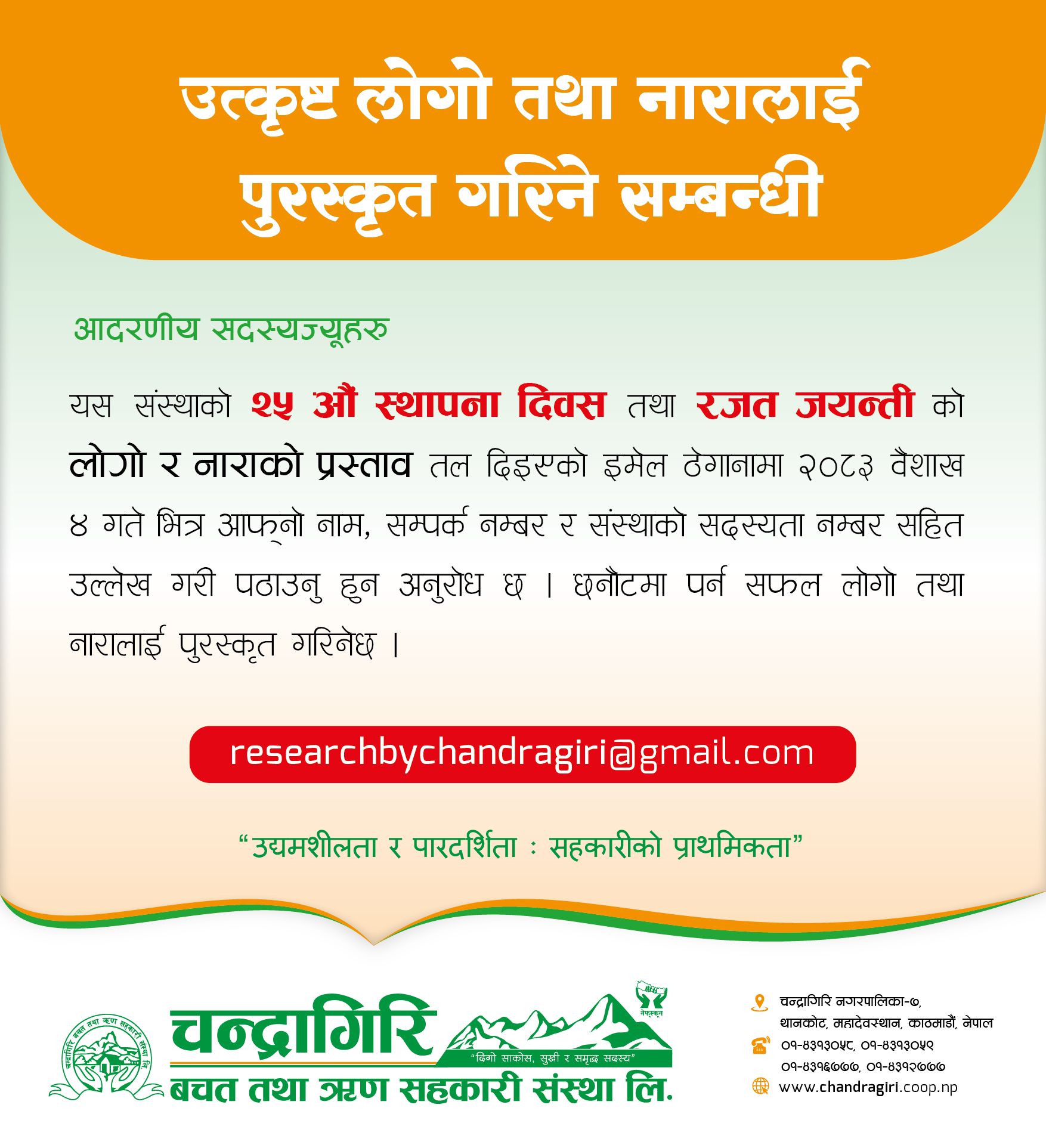 चन्द्रागिरि बचत तथा ऋण सहकारी संस्थाले संस्थाको २५ औं स्थापना दिवस तथा रजत जयन्तीका अवसरमा लोगो तथा नाराका लागि प्रस्ताव आह्वान गरेको छ ।