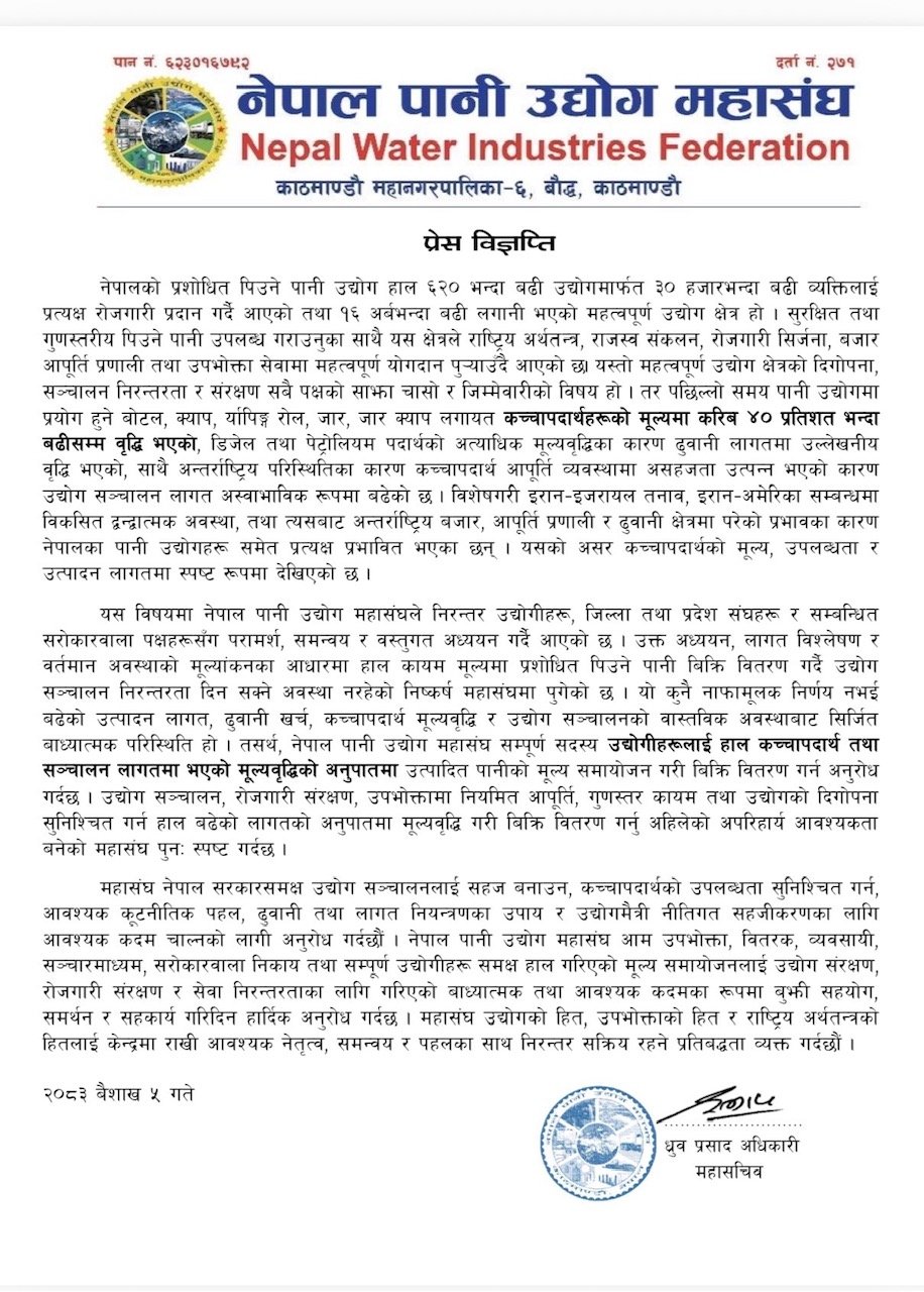महासंघले आफ्ना सम्पूर्ण सदस्य उद्योगीहरूलाई हाल कच्चापदार्थ तथा सञ्चालन लागतमा भएको मूल्यवृद्धिको अनुपातमा उत्पादित पानीको मूल्य समायोजन गरी बिक्री गर्न आग्रह गरेको छ ।