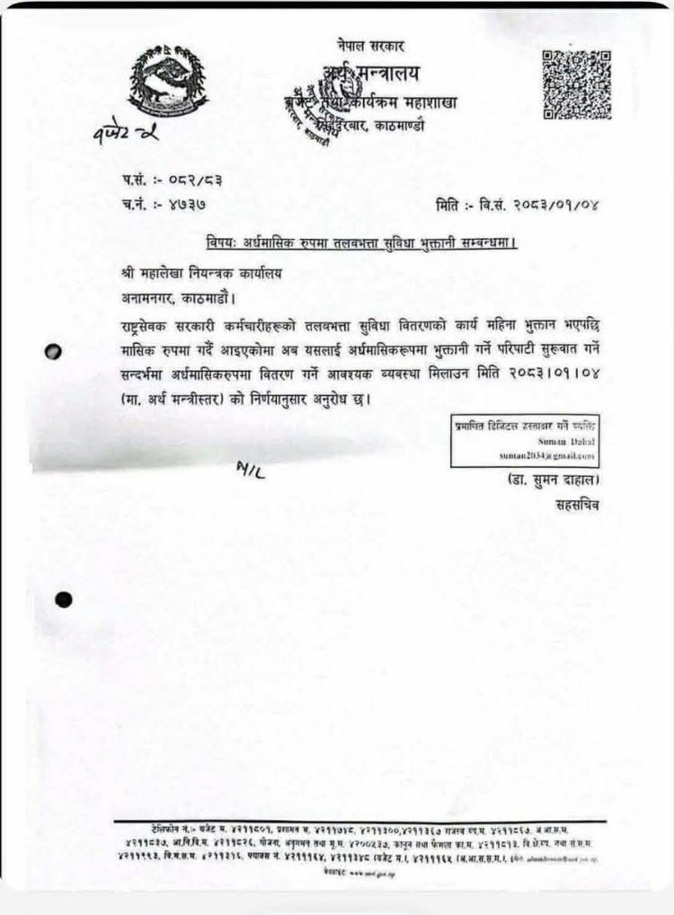 अर्थ मन्त्रालयले जारी गरेको पत्रअनुसार हालसम्म मासिक रूपमा वितरण हुँदै आएको तलबभत्ता अब अर्धमासिक रूपमा भुक्तानी गर्ने तयारी गरिएको हो ।