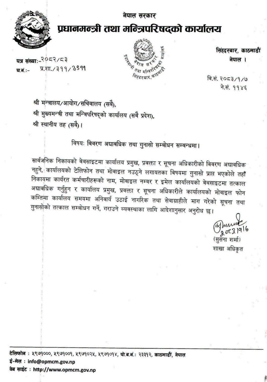 प्रधानमन्त्री तथा मन्त्रिपरिषद्को कार्यालयले देशभरका सबै सार्वजनिक निकायलाई आफ्ना कर्मचारीको विवरण अद्यावधिक गर्न र नागरिकका गुनासो तत्काल सम्बोधन गर्न निर्देशन दिएको छ ।