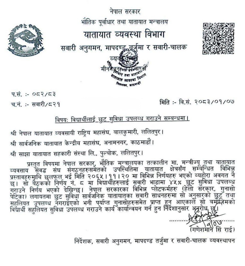 सरकारले सार्वजनिक सवारीसाधनमा विद्यार्थीलाई दिइँदै आएको ४५ प्रतिशत भाडा छुट अनिवार्य रूपमा लागू गर्न निर्देशन दिएको छ ।