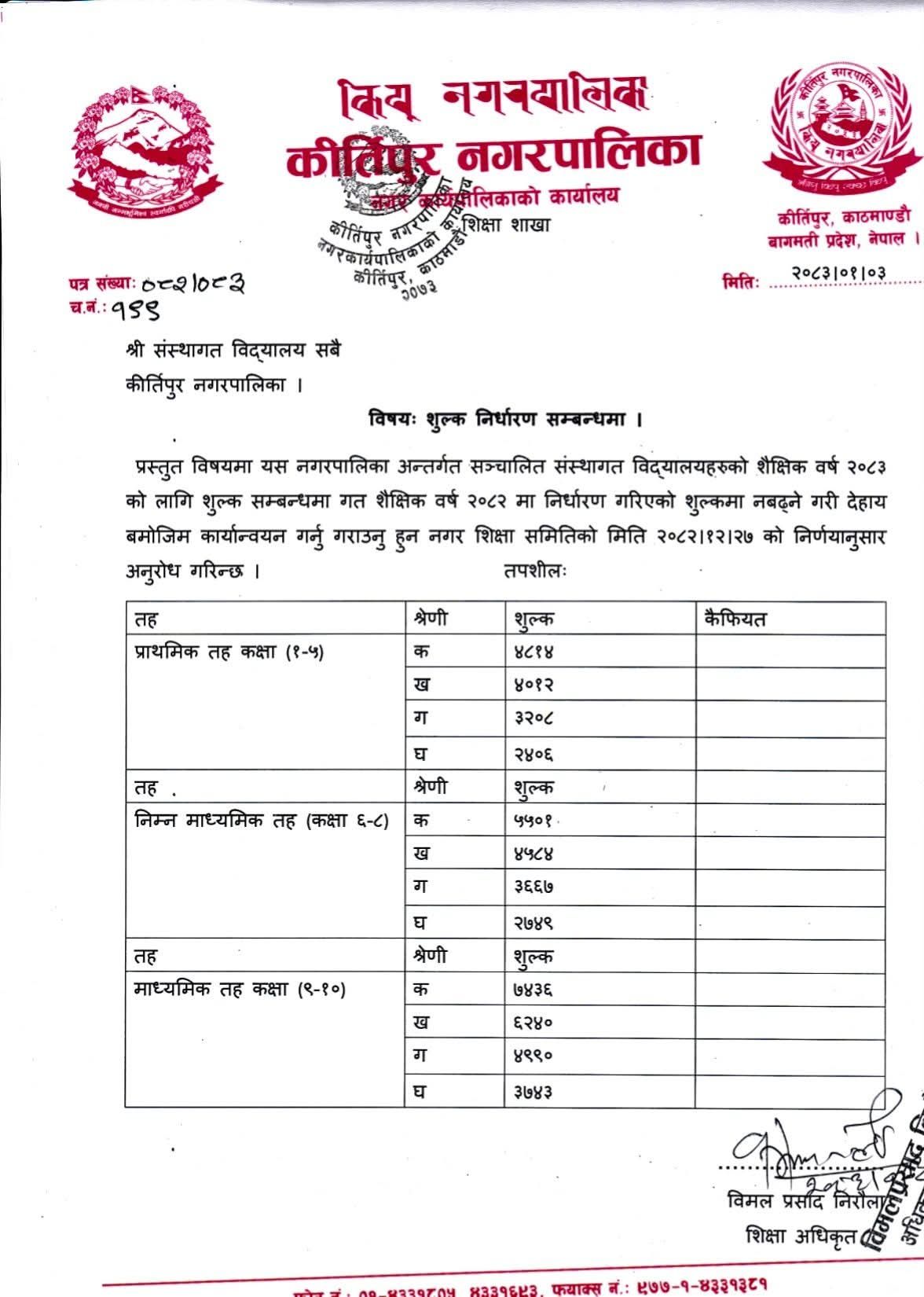 कीर्तिपुर नगर क्षेत्रमा सञ्चालनमा रहेका संस्थागत विद्यालयले मासिक कति लिन सक्नेछन सूची हेराैंः