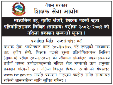 आयोगले सोमबार सार्वजनिक सूचना जारी गर्दै माध्यमिक तह, तृतीय श्रेणी, शिक्षक पदको खुल्ला प्रतियोगितात्मक लिखित (सामान्य) परीक्षा २०८२/२०८३ को परीक्षामा सम्मिलित भएकाहरूमध्ये उत्तीर्ण भएका उम्मेदवारहरूको नतिजा प्रकाशन गरेको हो ।