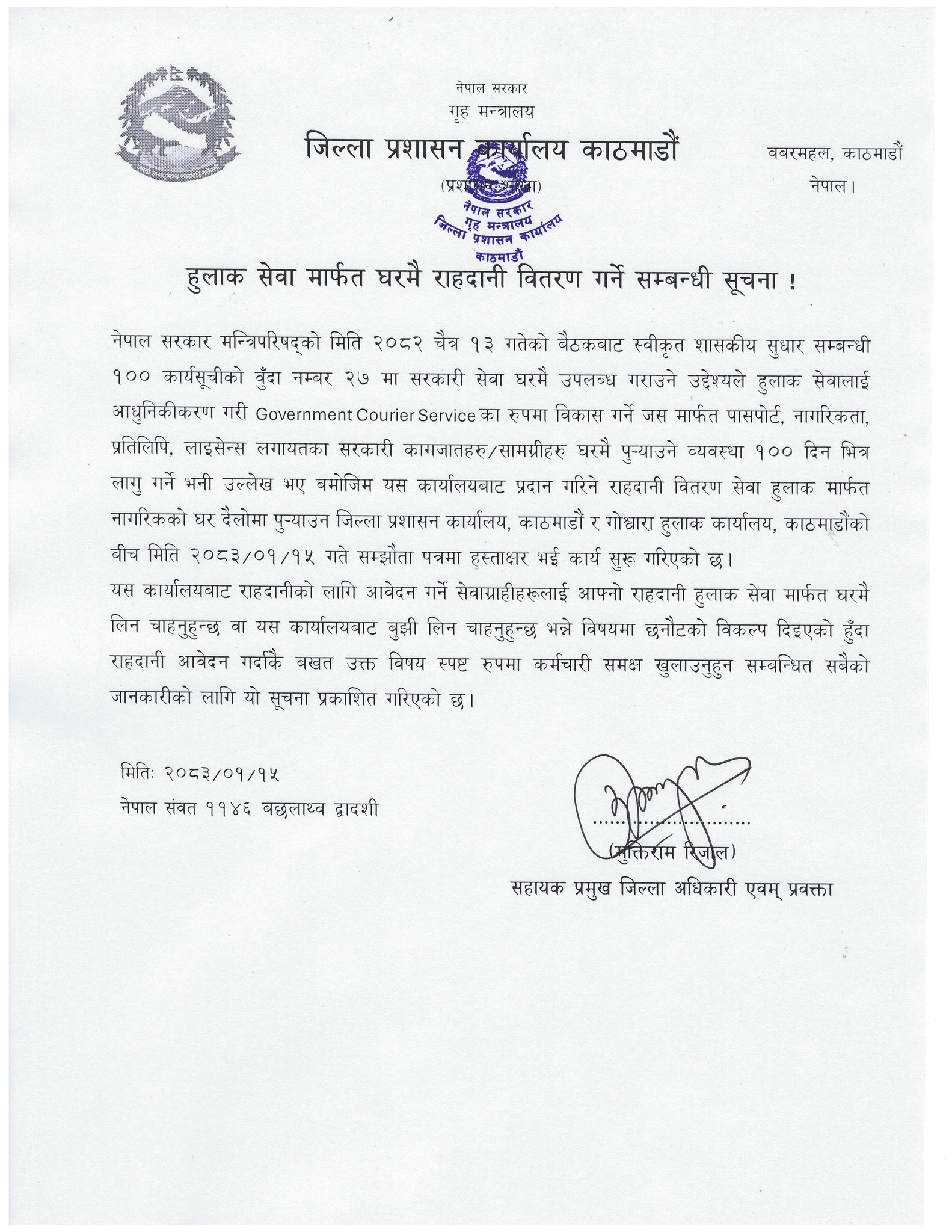 जिल्ला प्रशासन कार्यालय काठमाडौंले हुलाक सेवामार्फत नागरिकको घरमै राहदानी पुर्याउने भएको छ ।